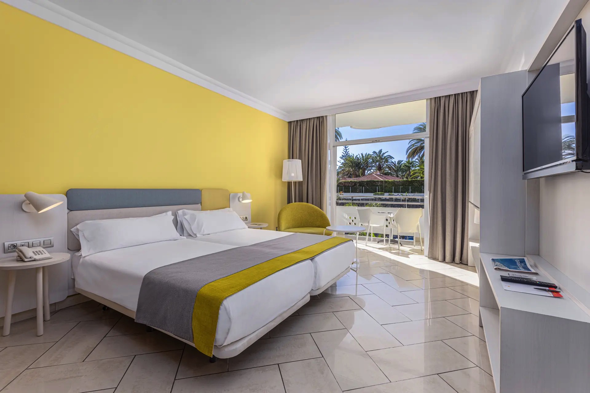 Jedes einzelne der Double Standard Adapted Zimmer des Hotels Abora Catarina wurde mit Blick auf Ihren Komfort und Ihr Wohlbefinden gestaltet. Genießen Sie einen geräumigen und funktionalen Raum mit zwei Einzelbetten, die sich leicht in ein Doppelbett umwandeln lassen, ideal, um Ihnen die ruhige Erholung zu bieten, die Sie nach einem Tag voller Aktivitäten und Spaß in Playa del Inglés brauchen.